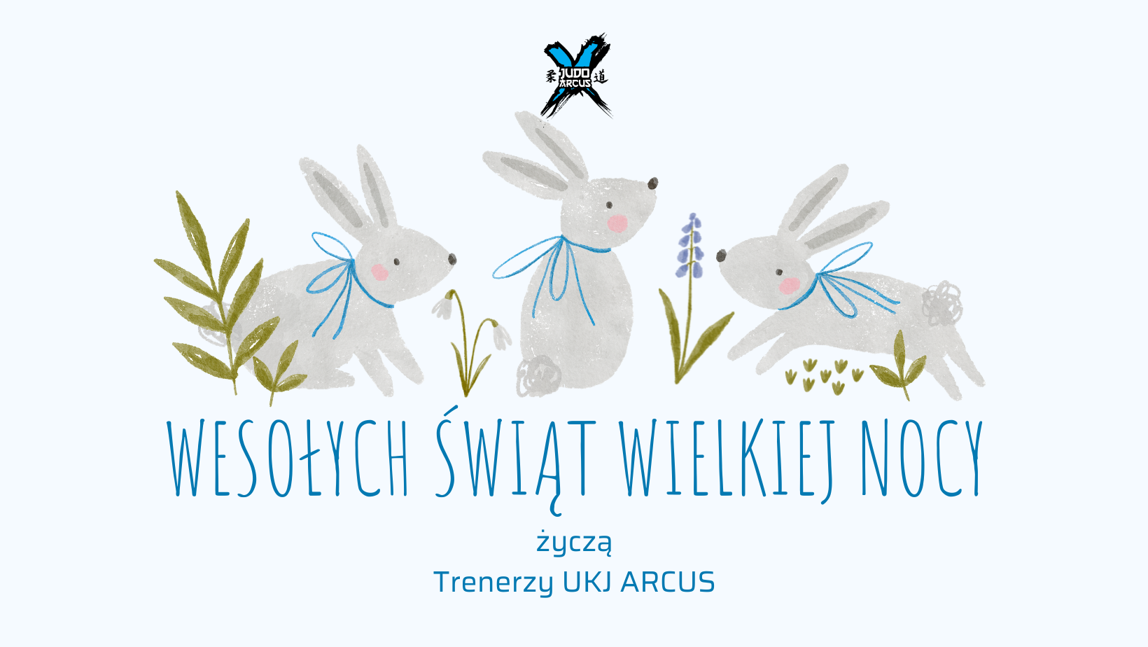 Grafika wielkanocna w stylu delikatnej, akwarelowej ilustracji na jasnobłękitnym tle. W centralnej części znajdują się trzy szare zajączki z zawiązanymi na szyjach błękitnymi kokardkami, przedstawione wśród wiosennych roślin i kwiatów. Nad zajączkami umieszczono logo UKJ Arcus. Poniżej widnieje duży napis w kolorze niebieskim: „WESOŁYCH ŚWIĄT WIELKIEJ NOCY życzą Trenerzy UKJ ARCUS”.